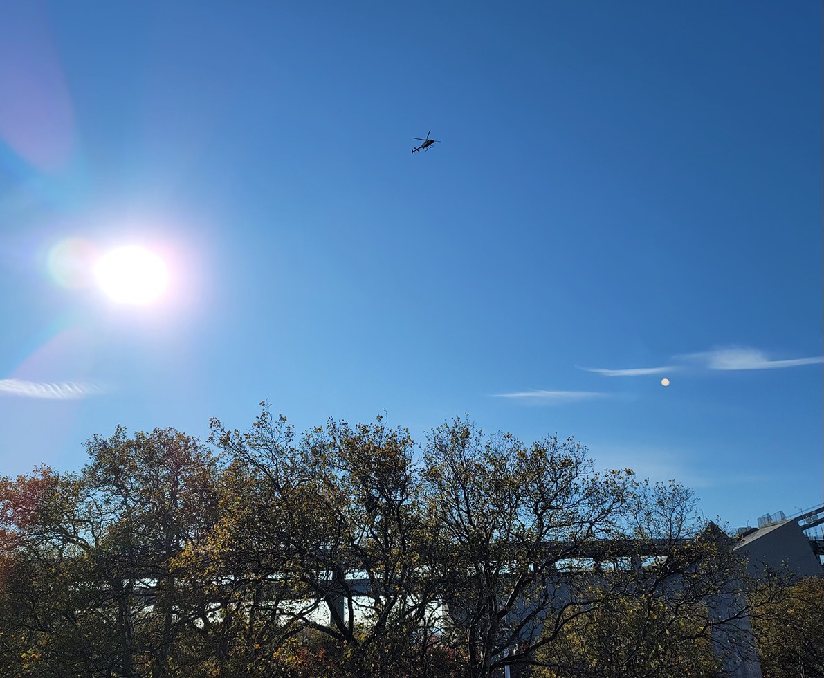 This helicopter, displaying some sort of banner advertisement - flew over the area all morning. It was joined by other surveillance and media helicopters - some flying over the park across the street and closer to my apartment than ever before.