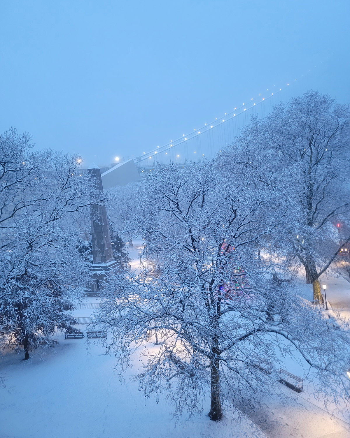 I woke up at 7:00 am with the enthusiasm of a little child on Christmas morning as I ran to the window to see the first snow of winter set against a backdrop of the Verrazano Bridge - just before the lights on the Christmas tree in the park outside automatically shut off.