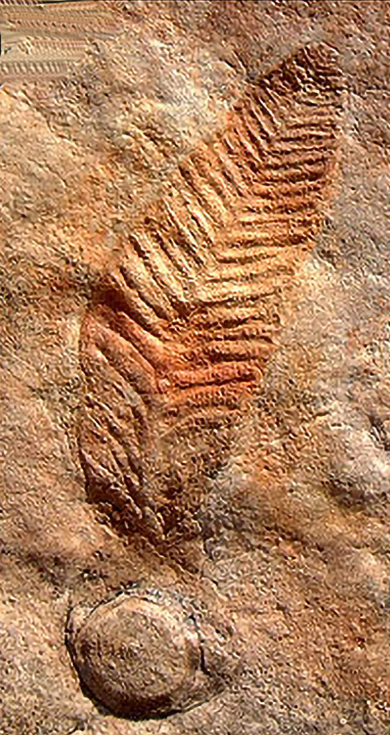 That exceptional preservation is cracking the mystery of Ediacara. In some spots the surface has eroded and we see for the first time what was inside an Ediacaran fossil. Each frond element, a few centimetres long, was made of many tubes held up by a semi-rigid organic skeleton. The frond elements had branches which themselves had branches, a classic fractal structure. Frondlets assembled themselves like building blocks to make larger living structures attached to the sea floor. Narbonne found rangeomorphs assembled in several different shapes, which he believes filtered food from different levels of the water column, as well as isolated free-living frondlets.