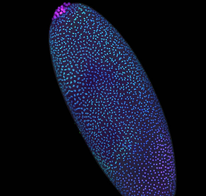 An early Drosophila embryo captured during a wave of nuclear division. Dividing nuclei (blue) and non-dividing nuclei (pink) illustrate the rapid, highly organized nature of early development and the substantial regulation of genome organization needed to enable proper gene activation despite repeated disruption as nuclei divide.