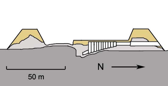 From the North face of the structure, an horizontal corridor, whose entrance is at ground level, goes straight into the center of the structure. The corridor then continues to a descending gallery, lined with limestone, topped by eleven arches and reinforced with pilasters. The gallery finally leads to the burial chamber, placed in the center of the building's base.