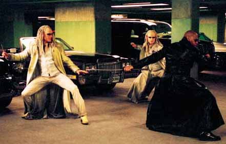 To find the key maker he encounters Luciferian mastermind Merovingian whose henchmen are called The Twins, twin albinos, who can morph into anything and seem unstoppable, until they are killed by Morpheus after an 18 minute car chase to save the Key Maker and open the door to the truth. (lots of metaphors here with a link to the Merovingian bloodline, the "Da Vinci Code", and possibly Mary Magdalene.)