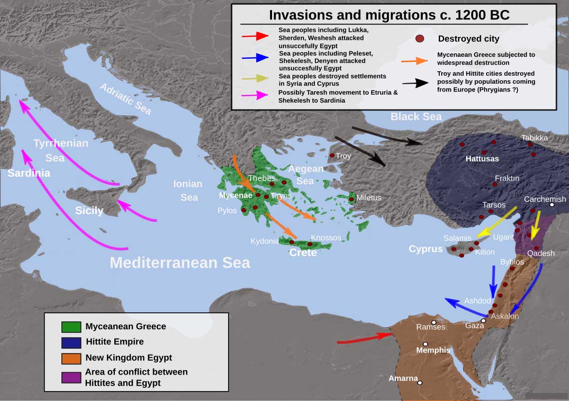 Whatever the identity, their arrival may account for the widespread abandonment of cities across Anatolia, Syria, Phoenicia, Canaan, Cyprus, and Egypt between the 13th and 12th centuries BCE.