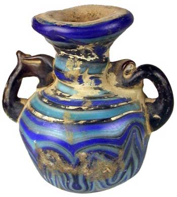 Thousands of Phoenician glass bottles were made to hold oil, wine and other liquids and they were often square-shaped so that they could be packed together conveniently. Glass for ordinary use often had a pleasant blue, green or brown tinge because, although the glassmakers could make clear glass, it was very expensive. One of the oldest glass making techniques ever used was the core-formed method. Molten glass was trailed or gathered around a core of animal dung mixed with clay and supported by a rod. After forming and cooling, the object is removed from the rod and the core scraped out. Core-Formed Blue glass Aryballos, the two handles with marbled turquoise and navy blue feather bands.