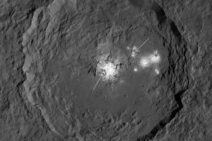 Occator is about 92 km wide, and two bright spots in it were seen even as Dawn approached Ceres in 2015, and were maddeningly vague until the spacecraft achieved orbit. Then the spots were resolved into many smaller ones, associated with cracks in the crater floor and on its central mound. Could they be ice? It turns out it was even better: They were mineral deposits! Ceres has an icy mantle beneath its surface, and deep cracks in the surface allow the ice to seep up. When it gets hit by sunlight it turns directly into a gas. And while this is water ice, it's not fresh water: It's briny, with mineral dissolved in it. When the ice sublimates it leaves those minerals behind, depositing them on the surface. Ceres is very dark, and the minerals much brighter, so they look white in the images.