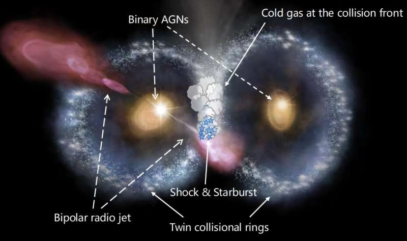 An international team of astronomers reports the detection of a peculiar merger of two similar ring galaxies that morphologically resemble an owl's face. The discovery of this galaxy merger, dubbed the "Cosmic Owl" . Galaxy mergers play a crucial role in the evolution of galaxies. These events redistribute the gas around galaxies, impact the stellar kinematics, transform galaxy morphology, and eventually lead to effective stellar mass assembly.