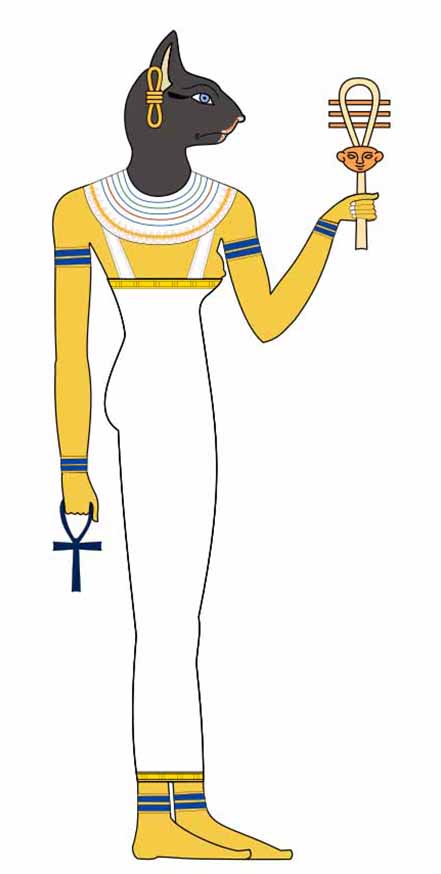 Bast or Bastet was the cat goddess and local deity of the town of Bubastis or Per-Bast in Egyptian, where her cult was centered. Bubastis was named after her. Originally she was viewed as the protector goddess of Lower Egypt, and consequently depicted as a fierce lioness. Indeed, her name means (female) devourer. As protector, she was seen as defender of the pharaoh, and consequently of the later chief male deity, Ra, who was a solar deity also, gaining her the titles Lady of Flame and Eye of Ra.