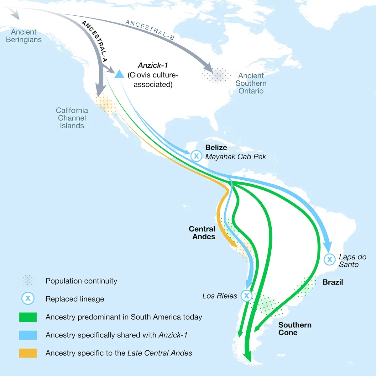An international team of researchers has revealed unexpected details about the peopling of Central and South America by studying the first high-quality ancient DNA data from those regions. The findings include two previously unknown genetic exchanges between North and South America, one of which represents a continent-wide population turnover. The results suggest that the people who spread the Clovis culture, the first widespread archaeological culture of North America, had a major demographic impact further south than previously appreciated. The authors analyzed genome-wide data from 49 individuals from Central and South America, some as old as 11,000 years. Previously, the only genomes that had been reported from this region and that provided sufficient quality data to analyze were less than 1,000 years old. By comparing ancient and modern genomes from the Americas and other parts of the globe, the researchers were able to obtain qualitatively new insights into the early history of Central and South America.