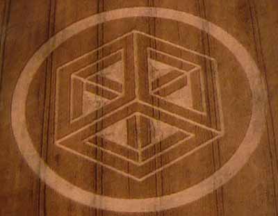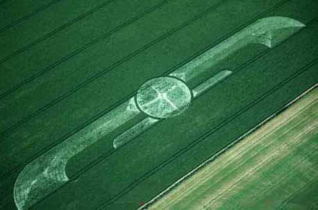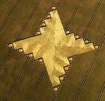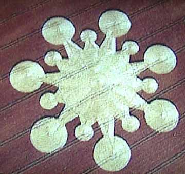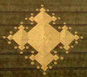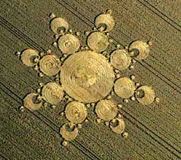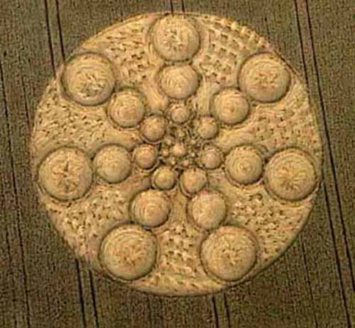 The 90-foot center circle has a bird's nest in the middle, which spirals out for a few feet, overlapping a radial lay, which in turn overlaps a clockwise lay that completes that circle. Each of the eight medium size circles has a different lay, ranging from the conventional, to S-swirl, to a sort of bizarre, spiral snake. These circles are each crowned with a small crescent, and (counting the ones inside the crescents) eight grapeshot adorn all of the eight "branches."