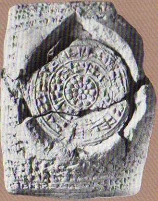 An early world map, circa 600 B.C., shows Babylon as a rectangle intersected by two vertical lines representing the Euphrates River. Small circle stand for surrounding kingdoms, and an ocean encircles the world.