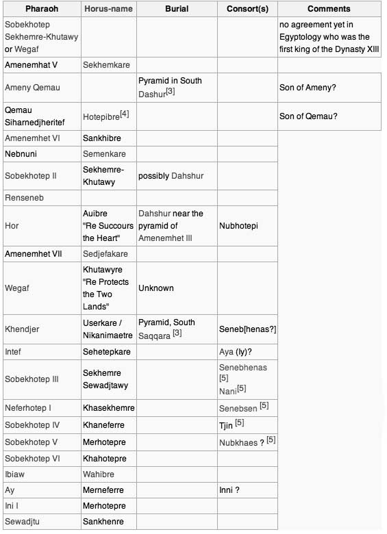 The thirteenth dynasty of ancient Egypt (notated Dynasty XIII) is often combined with Dynasties XI, XII and XIV under the group title Middle Kingdom. Other writers separate it from these dynasties and join it to Dynasties XIV through XVII as part of the Second Intermediate Period. Dynasty XIII was from approximately 1773 BC to sometime after 1650 BC.
