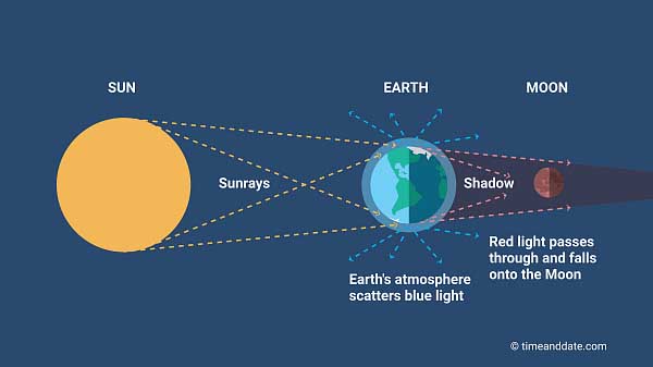 When the Moon is totally eclipsed by the Earth (a "deep eclipse"), it takes on a reddish color that is caused by the planet when it completely blocks direct sunlight from reaching the Moon's surface, as only the light reflected from the lunar surface has been refracted by the Earth's atmosphere. This light appears reddish due to the Rayleigh scattering of blue light, the same reason sunrises and sunsets are more orange than during the day.