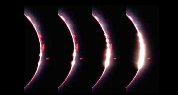 Pyramid Texts: "The eclipse represents the breaking of the Egg and Splitting the Iron." The iron is the rod, the magnetic poles, north/south, duality of experience created by electromagnetic energy, the aura, needed to create a physical reality and the illusion of linear time. The Two 'Diamond Ring Effects' crowned the eclipsed shadow on the head of Re.