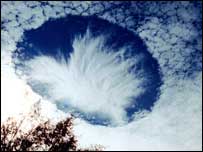 Alabama: 'Hole in sky' amazes scientists BBC, January 16, 2004 A giant hole that appeared in a uniform layer of cloud over Mobile, Alabama, in the US, has left scientists puzzled.