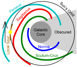 The Sun (and therefore the Earth and the Solar System) may be found close to the inner rim of the galaxy's Orion Arm, in the Local Fluff inside the Local Bubble, and in the Gould Belt.