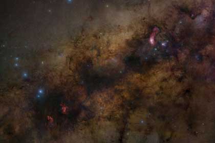 The Milky Way looks brightest in the direction of the constellation of Sagittarius, toward the galactic center. Relative to the celestial equator, it passes as far north as the constellation of Cassiopeia and as far south as the constellation of Crux, indicating the high inclination of Earth's equatorial plane and the plane of the ecliptic relative to the galactic plane.