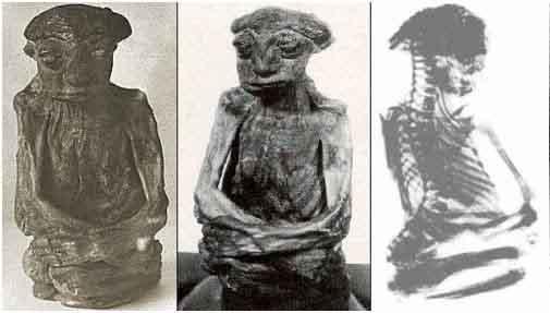 This first mummy was examined using X-rays which determined that it was the body of an anencephalic infant "whose cranial deformity gave it the appearance of a miniature adult." A second mummy examined by University of Wyoming anthropologist George Gill and the Denver Children's Hospital in the 1990s was also shown to be an anencephalic infant. DNA testing showed it to be Native American and radiocarbon dating dated it to about 1700.