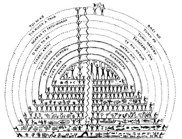 The drawing shown above was made in 1869 by Paiore, a man from the Paumotu group of islands in Tuamotu, Polynesia, to illustrate the ancestors' role in the lifting up of the layered heavens at the time of creation. The Toba Batak people, of Sumatra, describe the condition of the world prior to creation as if people somehow already existed to witness this state of chaos: "In the very beginning, in by-gone times, when the middleworld in which we live did not yet exist, there was only the sea; there was one sea and there was a thick darkness, (so dense that) people could not see their hands before their faces."