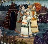 This is a wonderful, dramatic Eskimo myth, parts of which are widely known, spread from Siberia to Greenland. The myth speaks of society rather than the universe. Raven is a trickster god who travels from heaven to earth and sometimes, in some stories, to the seafloor. He has sacred power and can change form. Raven instructs people in living. He creates first-man through the pea vine and other people and animals from clay taken from the earth-creek. Eskimo Woman Prophecy