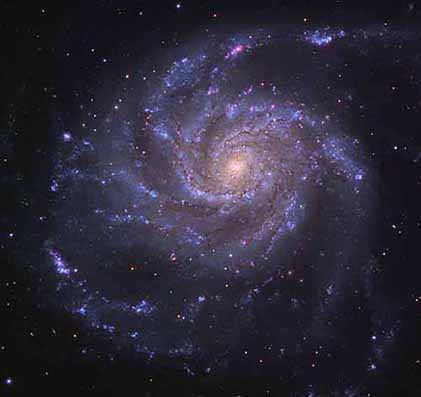 Why do many galaxies appear as spirals? A striking example is M101, shown above, whose relatively close distance of about 27 million light years allows it to be studied in some detail. Recent evidence indicates that a close gravitational interaction with a neighboring galaxy created waves of high mass and condensed gas which continue to orbit the galaxy center. These waves compress existing gas and cause star formation. One result is that M101, also called the Pinwheel Galaxy, has several extremely bright star-forming regions (called HII regions) spread across its spiral arms. M101 is so large that its immense gravity distorts smaller nearby galaxies.
