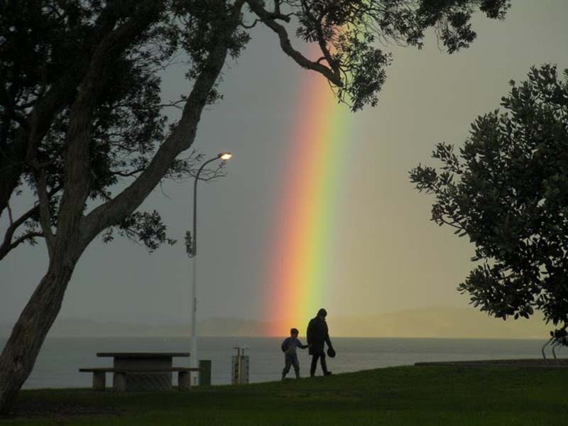 Rainbow after sunlight bursts through after an intense shower in Maraetai, New Zealand