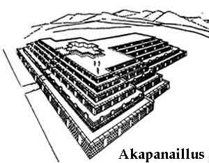 The largest terraced step pyramid of the city, the Akapana, was once believed to be a modified hill, and has proven to be a massive human construction with a base 656 feet square and a height of 55.8 feet. It is aligned perfectly with the cardinal directions. Its base is formed of beautifully cut and joined facing stone blocks. Within the cut- stone retaining walls are six T- shaped terraces with vertical stone pillars, an architectural technique that is also used in most of the other Tiwanaku monuments. It originally had a covering of smooth Andesite stone, but 90% of that has disappeared due to weathering. The ruinous state of the pyramid is due to its being used as a stone quarry for later buildings at La Paz. Its interior is honeycombed with shafts in a complicated grid pattern, which incorporates a system of weirs used to direct water from a tank on top, going through a series of levels,and finally ending up in a stone canal surrounding the pyramid. On the summit of the Akapana there was a sunken court with an area 164 feet square serviced by a subterranean drainage system that remains unexplained.