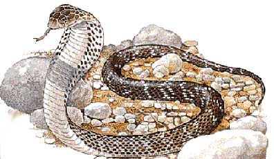 The cobra was almost always portrayed rearing up and with its hood dilated. The Greek word uraeus is typically used to describe the cobra in this pose. The word may have its origins from the Egyptian words which meant she who rears up. The species of cobra represented as the uraeus is the Naja haje.