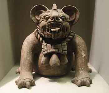The Zapotecs had a predominance of deities associated with fertility and agriculture. there are both male and female representation, told apart from each other by costumes. Males normally wear breechclouts and sometimes capes, while females are represented by wearing skirts. Prominent gods are Cocijo - god of lightning and rain, he is represented from Monte Alban 1-4. Another one is the god of maize Pitao Cozobi.