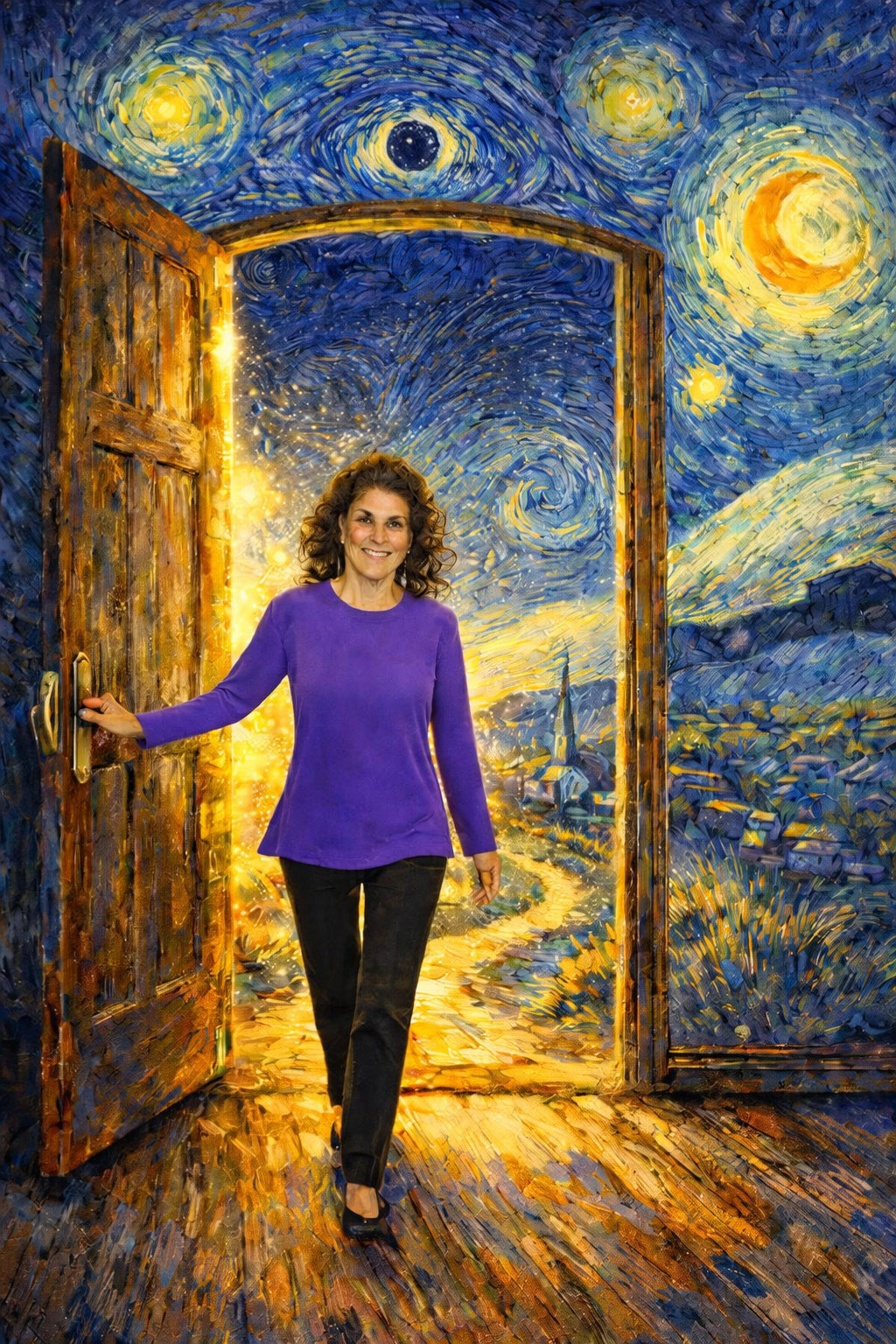 Ellie at MOMA standing next to Van Gogh's Original The Starry Night (1889)