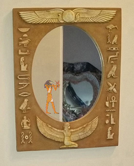 This pic of me was taken on 8.8 a few years go. What makes it interesting is ... we see a mirror reflecting a mirror depicting a bird where there was none. That bird to me represents Thoth who wrote the script for the human experiment. Further there is no reason why the Thoth side of the mirror should be black and white.