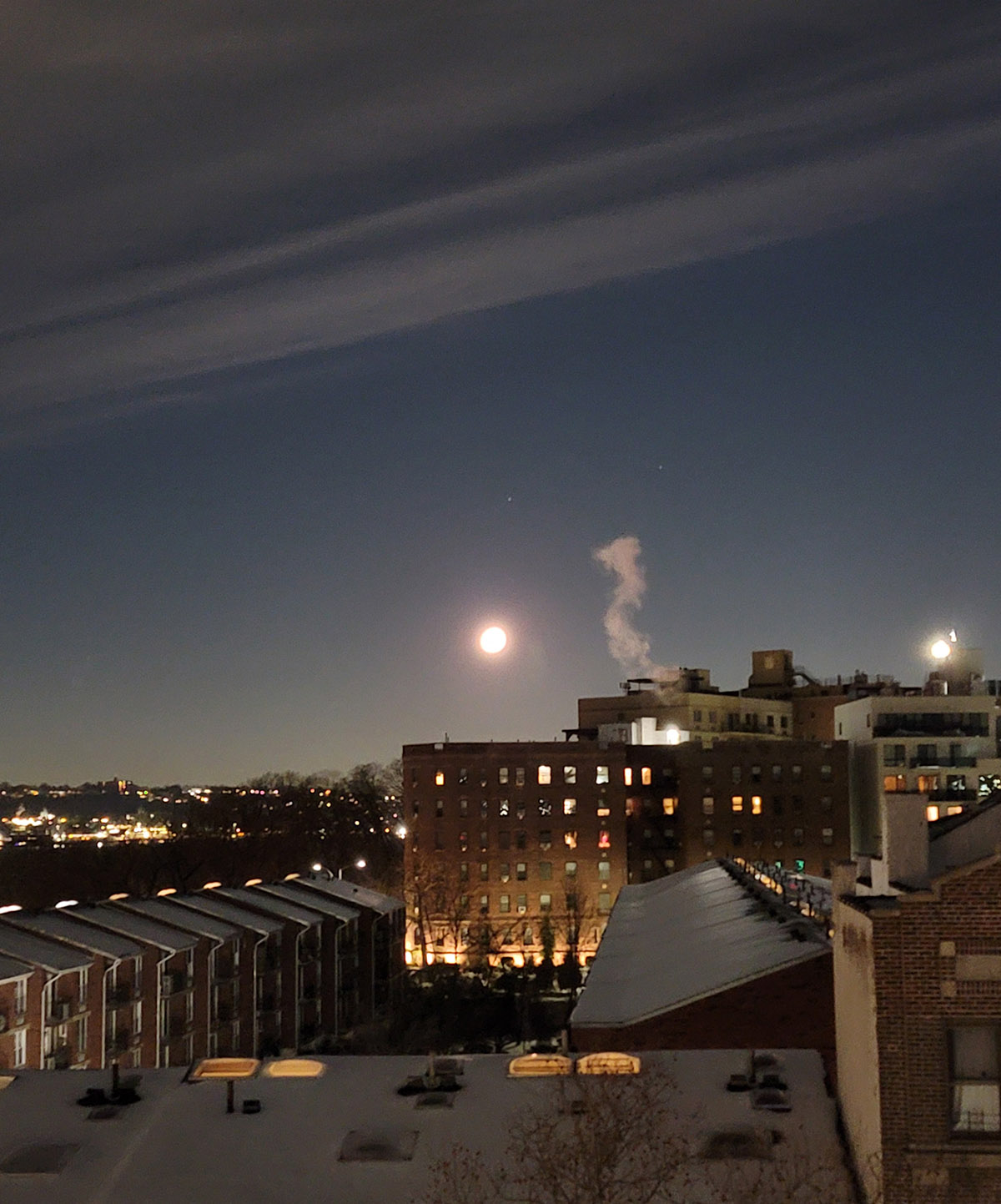Moon setting over Brooklyn beneath overhanging clouds - sets the stage for the full moon to welcome February tonight. The morning air is still as subfreezing temperatures continue to dominate. The streets lay bare for now - the first dog walker to go by soon. Two stars, rarely seen due to city lights, twinkle through the darkness. Smoke-formed patterns rise from a chimney nearby to greet their celestial friends as January comes to an end.