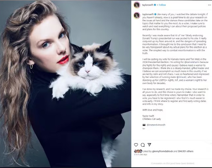 Now let's get to another highlight after the debate - Taylor Swift on Instagram supporting Kamala Harris. We all knew this was coming but life is about timing and she timed her announcement perfectly. Taylor and Beyonce and so many other celebs in all walks life doing the same thing. This will influence Taylor's followers - the millions of Swifties, their friends and families who will vote for Harris - which could turn the tides in November.