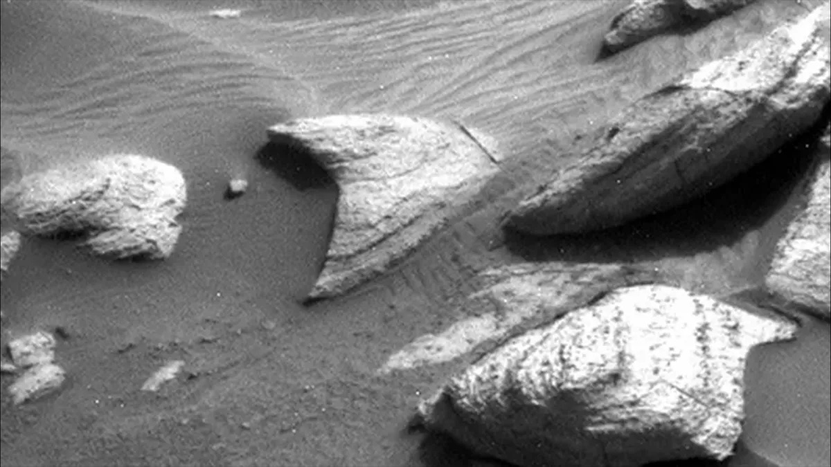 Did someone leave a communicator badge lying on Mars? NASA's long-running Curiosity rover mission just spotted a familiar shape to "Star Trek" fans: The iconic delta-shaped emblem that Starfleet officers typically wear on their uniforms. Unfortunately, it would be highly illogical to say that a Starfleet landing party walked near Curiosity's roving grounds, as the image was of a mere Mars rock that just so happens to resemble the "Star Trek" symbol. The image was originally posted on the Mars Curiosity raw images site provided by NASA's Jet Propulsion Laboratory (JPL). It was taken with the rover's left navigation camera on Mars day, or sol, 4062 of the mission on Jan. 9.