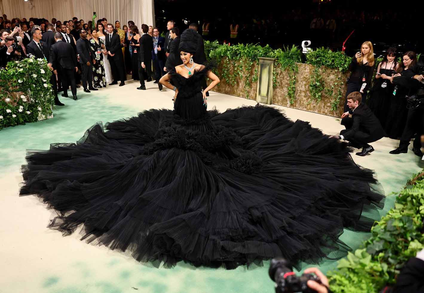 Many of the fashions unfolded like a time travel machine back to origin stories from the Garden of Eden to the black hole of creation. Here's Cardi B emerging from chaos. (That personifies her. She made me laugh as she barked orders at the men adjusting the endless yards of fabric in her design. All good fun.)