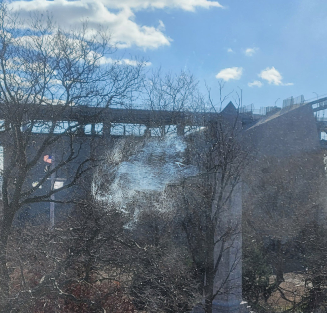 The image of Jesus looking down appears in the branches below the exit ramp of the Verrazano Bridge. It is above the heart that also appears as bird imagery.