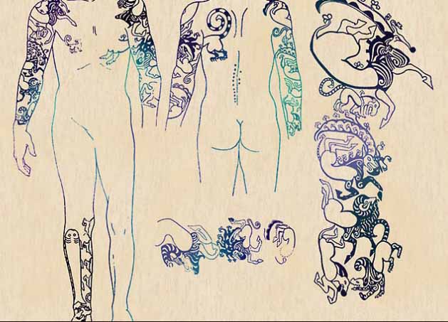 The chieftain was preserved as an "ice-cube" because water leaked into the kurgan and froze immediately and permanently. His arms, shoulders and parts of his torso and one leg were covered with unique bold blackline tribal animal motifs. They have stylistic echoes of Persian, Assyrian, Indian art and particularly strong parallels in the Zhou (Chou) Dynasty and Warring States periods of Chinese art.