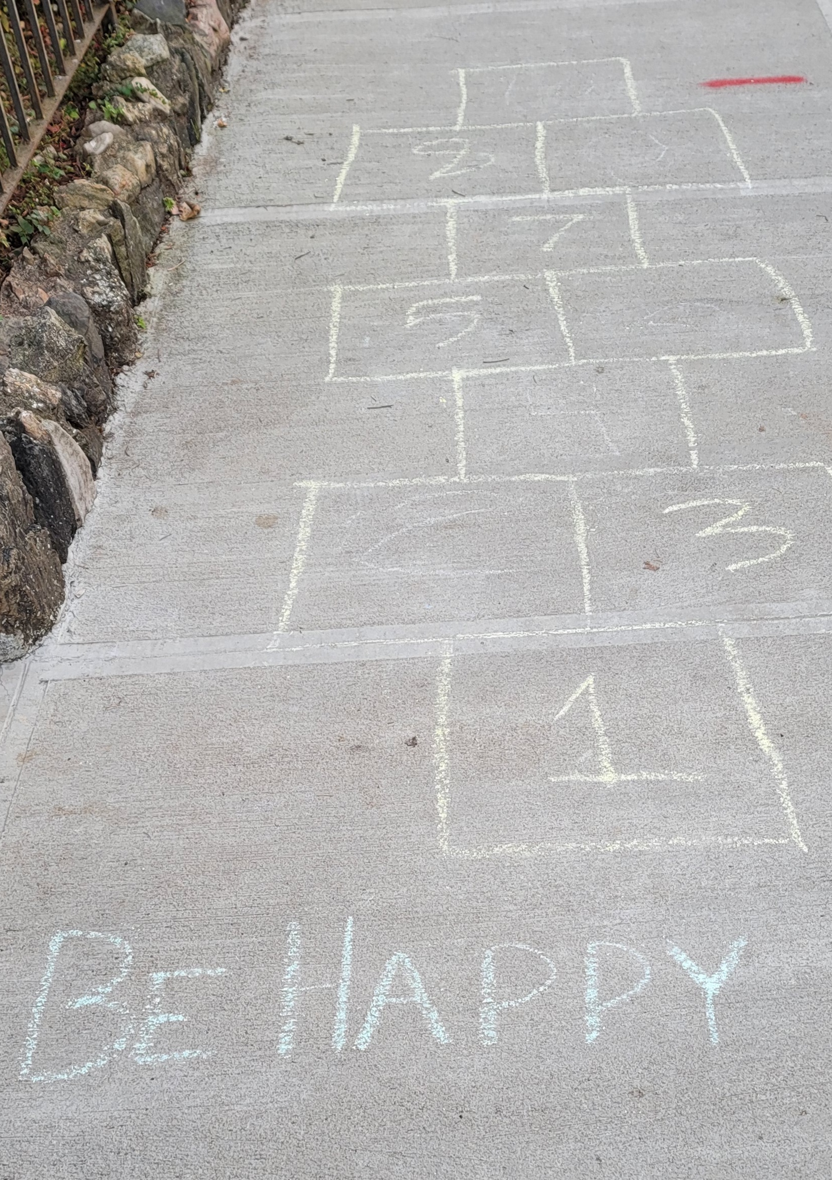 Monday I walked past two 12 year old girls playing hopscotch after school. One was Muslim wearing a hijab - the other was not. They were laughing and having fun as besties do at that age. I'm sure they are aware of the dangers in today's world but in that moment they were just two friends who wanted to "Be Happy" which they had written on the ground as a memo to those who walked by. We smiled at each other. They asked if I wanted to play but I didn't have 'time' leaving them to enjoy the moment.