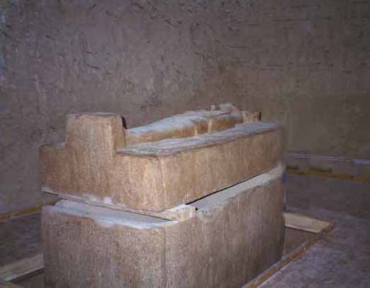 A final wider corridor leads past two abandoned lateral corridors before giving way into the unfinished, transverse burial chamber. Here, a granite sarcophagus is set into an roughly finished rectangular niche in the floor just behind a transverse row of four pillars. The abandoned lateral corridors may have been meant to give into a burial chamber or storage annexes, but this work was stopped after the a corridor broke into the nearby tomb, KV32. The openings were then sealed with limestone slabs.