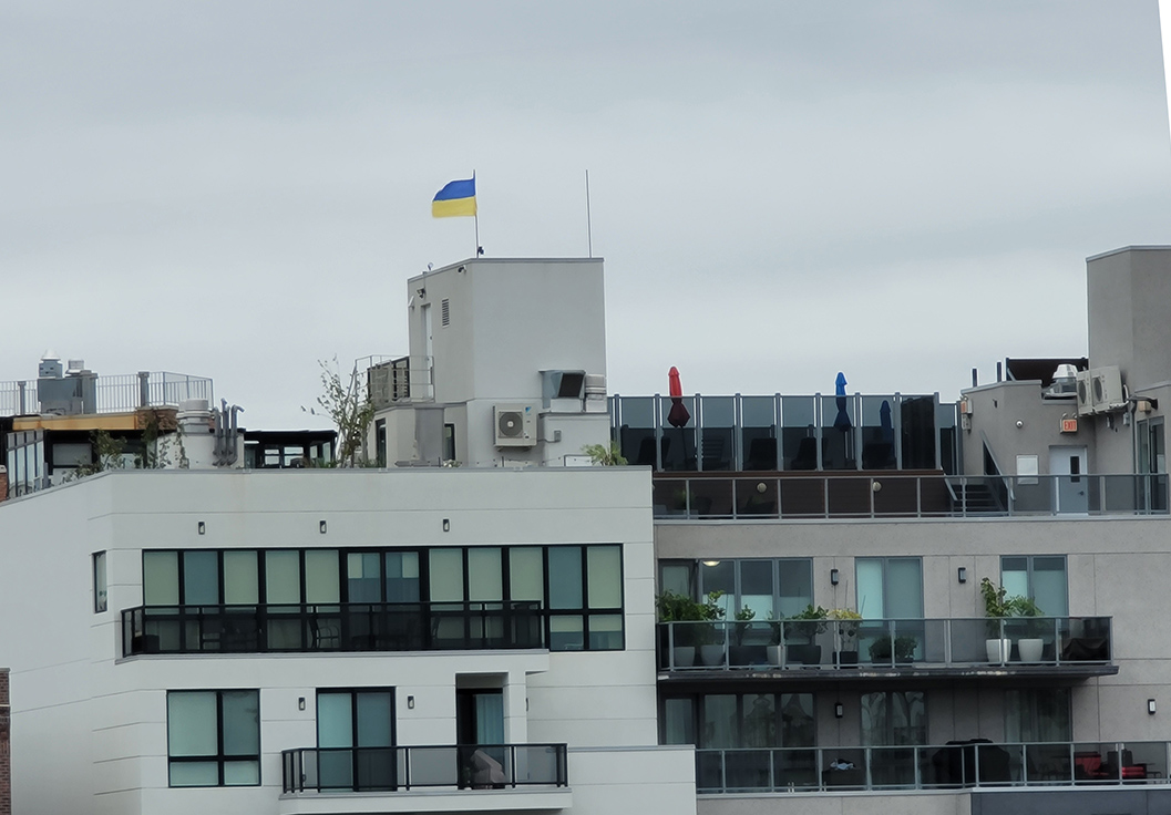 When Russia invaded Ukraine on February 24, 2022 - the American and the Ukrainian flags were seen flying over this building across the next street. Today all that remains is the Ukraine flag still in good condition. Through the years I watched the American flag become tattered and torn from the effects of weather - its last remnants blown away at the end of 2024 after Trump was reelected.