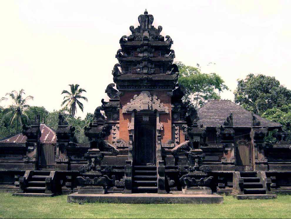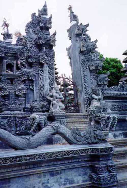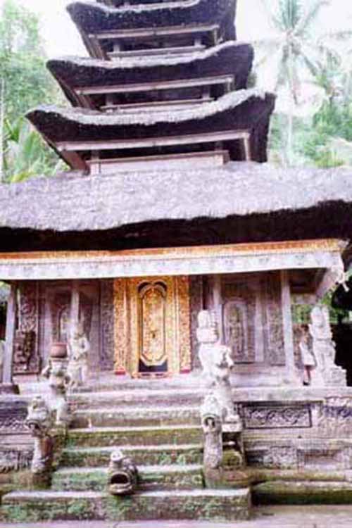 Every village compound has at least three large temples: the Pura Desa, where religious festivals are celebrated, the Pura Dalem for the Goddess of Death (this is the place where the funeral cremation rites start), and the Pura Puseh that is dedicated to the Gods of Heaven. Temples are everywhere, on the mountains and in the valleys, in the ricefields (they are small shrines for the Rice Goddess), and on the seaside, and every temple is different.