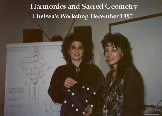 Approximately fifty people attended Chelsea's workshop on sacred geometry and harmonics, 50% male and 50% female energies. People sat on cushions on the floor or on chairs as the workshop began. The room was well lit. The energies were high. On a long table in front of the room Chelsea placed many visual aids related to sacred geometry. She also used diagrams and other schematics.