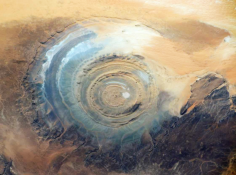 The Eye of the Sahara looks just like an enormous impact crater sitting in the middle of the Sahara Desert of Mauritania. Stretching 50 kilometers (30 miles) in diameter, comprised of a series of uniform ripples, this crater-esque anomaly is in fact entirely terrestrial.