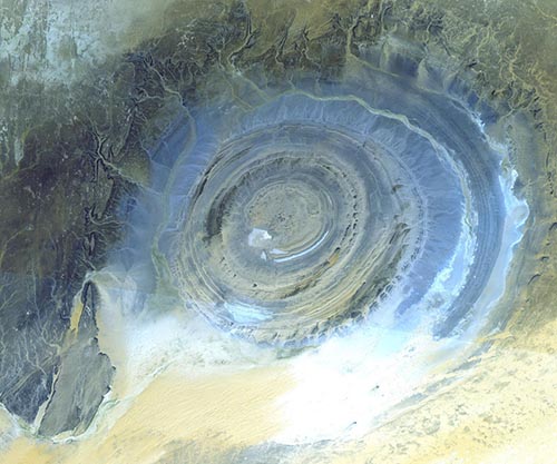 What on Earth is that? The Richat Structure in the Sahara Desert of Mauritania is easily visible from space because it is nearly 50 kilometers across. Once thought to be an impact crater, the Richat Structure's flat middle and lack of shock-altered rock indicates otherwise. The possibility that the Richat Structure was formed by a volcanic eruption also seems improbable because of the lack of a dome of igneous or volcanic rock. Rather, the layered sedimentary rock of the Richat structure is now thought by many to have been caused by uplifted rock sculpted by erosion. The above image was captured by the ASTER instruments onboard the orbiting orbiting Terra satellite. Why the Richat Structure is nearly circular remains a mystery.
