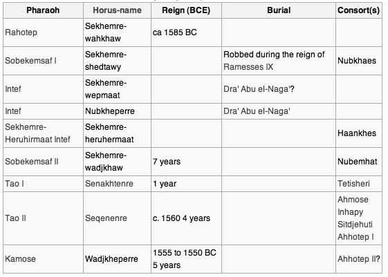 The Fifteenth, Sixteenth and Seventeenth Dynasties of ancient Egypt are often combined under the group title, Second Intermediate Period. The Seventeenth Dynasty dates approximately from 1580 to 1550 BC.