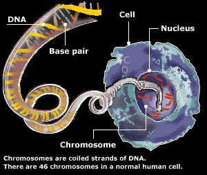 Each chromosome is made up of a molecule of DNA in the shape of a double helix which is composed of four chemical bases represented by the letters A (adenine), T (thymine), G (guanine) and C (cytosine). The arrangement, or sequence, of the letters determines the cell's genetic code.