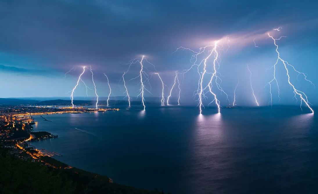 Dark purple sky with loads of bright white lightning bolts striking the sea. Yellow lights from houses visible on the edge of the water.