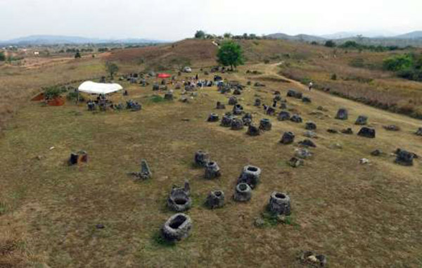 The Plain of Jars is a megalithic archaeological landscape in Laos. It consists of thousands of stone jars scattered around the upland valleys and the lower foothills of the central plain of the Xiangkhoang Plateau. The jars are mostly arranged in clusters ranging in number from one to several hundred.