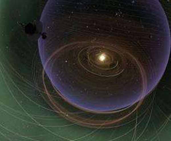 The Fluff is held at bay just beyond the edge of the solar system by the sun's magnetic field, which is inflated by solar wind into a magnetic bubble more than 10 billion km wide. Called the "heliosphere," this bubble acts as a shield that helps protect the inner solar system from galactic cosmic rays and interstellar clouds. The two Voyagers are located in the outermost layer of the heliosphere, or "heliosheath," where the solar wind is slowed by the pressure of interstellar gas.