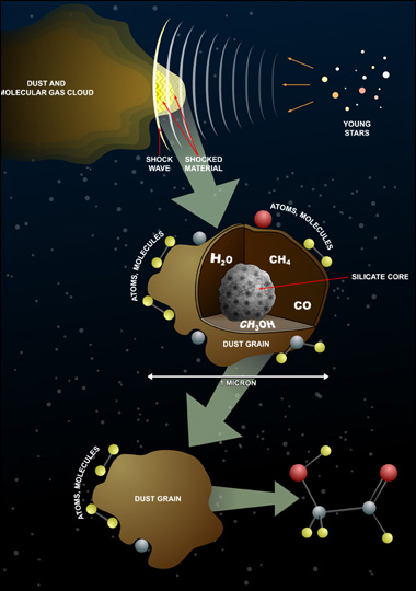 What probably provided the sugar-making oomph was a shock wave from an exploding star. A shock wave would heat up pre-existing simpler molecules; water, ammonia, formaldehyde, methane, ammonia or carbon dioxide; so they could react and build the sugar. Once the reactions occurred, the molecules dispersed and cooled. The simpler molecules are thought to form on the surfaces of dust particles.