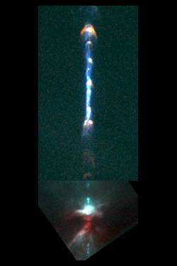 A thin and wispy stellar jet protrudes from the head of the dense cloud and extends almost a light year into the cloud. The jet's source is a very young star that lies buried within the cloud.